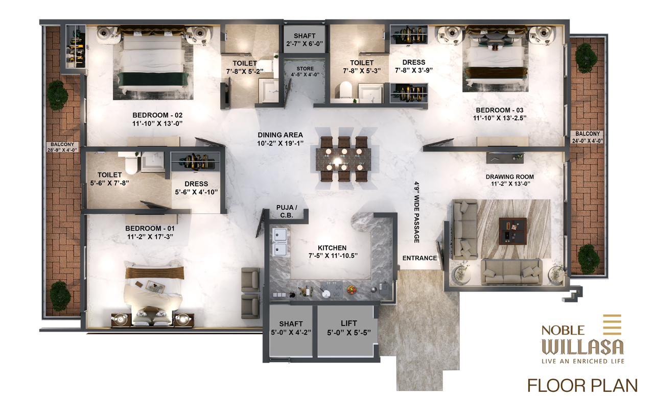 Noble Willasa floor plan gives you ample space with 3 bedrooms, a lavish drawing dining, mudular kitchen & 3 washrooms. To see Noble Willasa price list click here. For project site plan, click here